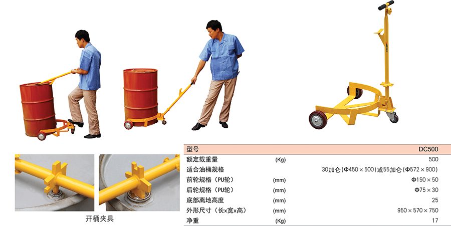 ● 手柄用做杠桿,支起油桶,推入小車即可移動油桶。
